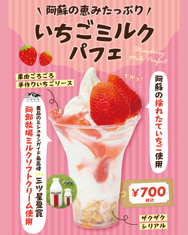 阿蘇で育った甘〜いいちごを使用した、贅沢な「いちごミルクパフェ」が登場✨