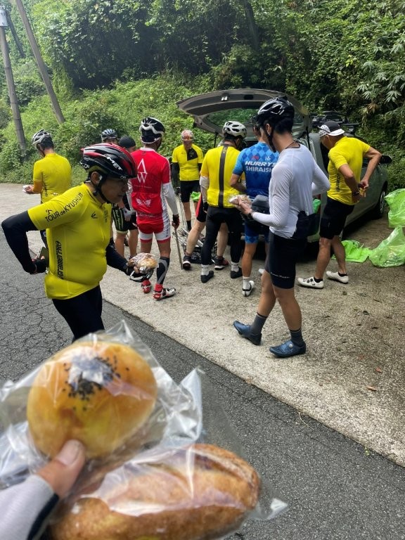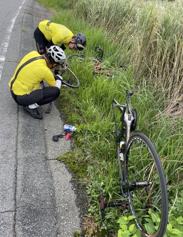 UBUYAMA PLACEから下り基調で57号を渡ると、まさに波のような地形が連続する波野地区のアップダウンになる。ここで久し振りのパンクの方がいた。グループライドでは全員が「次は自分かもしれない」という意識を持って修理に協力しなくてはならない。