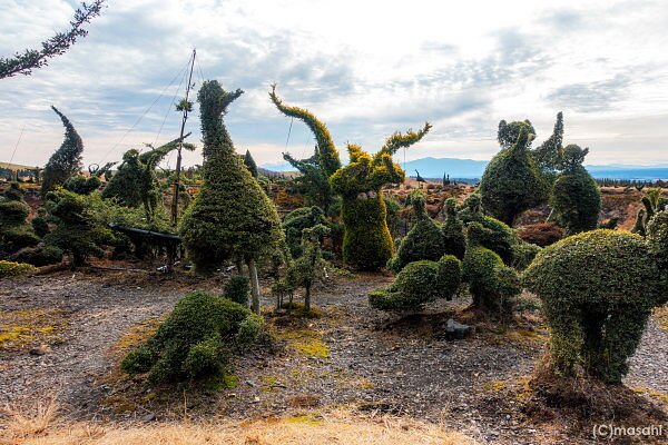 やまなみハイウェイ沿いにある「千羽鶴鹿公園」は、ヒゴタイ公園入口の近くにあり、見渡す限り山ツゲという木が千羽鶴や動物などのかたちに刈り込まれている。これは「トピアリー」という植物を人工的・立体的に形づくる園芸細工で、ここでトウモロコシを販売している若宮さんという方が30年以上かけてひとりで造られたものだ。