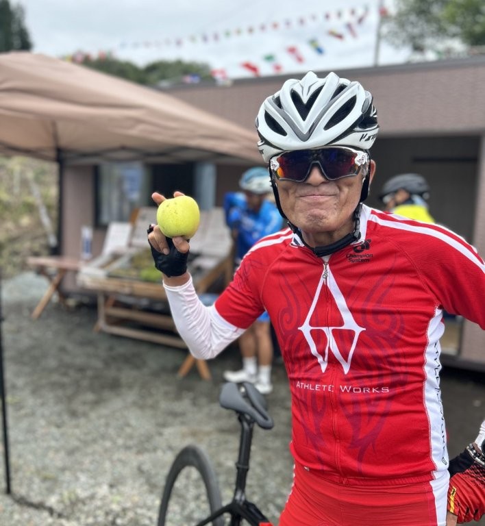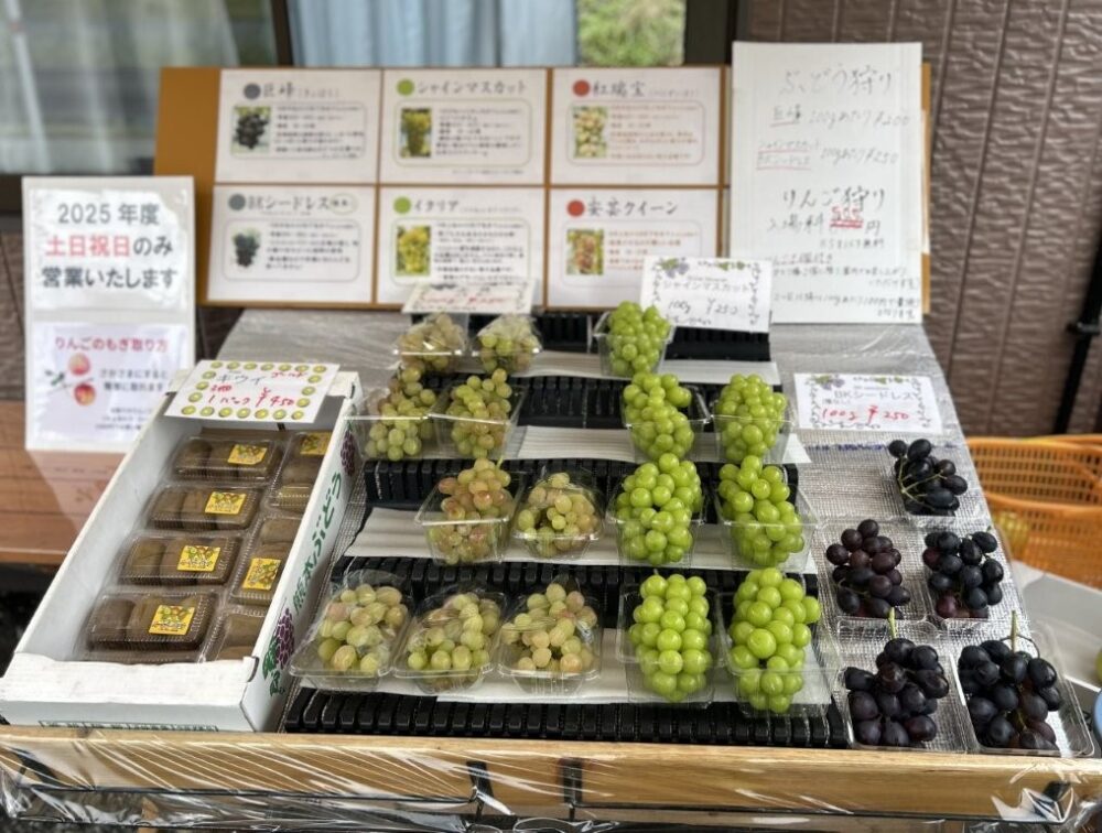 直売所のすぐ近くにブドウとリンゴの畑があり、ブドウは巨峰やシャインマスカットだけでなく、BKシードレスとかイタリア、安芸クイーンなど知らない実に旨そうな品種があった。ブドウはバックポケットには無理だが、リンゴは中玉くらいのサイズなら持って帰られるので買った。