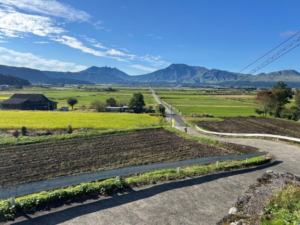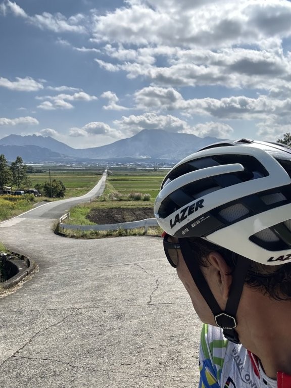 あっという間だったが感激の余韻は続いた。阿蘇谷を横断する一本道の先に阿蘇五岳、これ以上ない阿蘇サイクルスポーツの絵に間違いない。