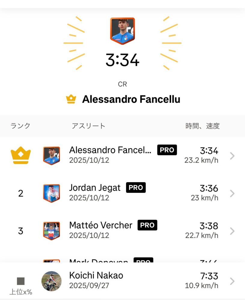 1位のTEAM UKYOのAlessandroha(3分34秒 23.2km/h)はこの日の山岳賞3位、トタルエナジーズのJordanは山岳賞4位、私の記録は7分33秒 10.9km/h、みなさんも是非この坂に挑戦し、出来れば23km/hで走れるだけ試していただきたい。