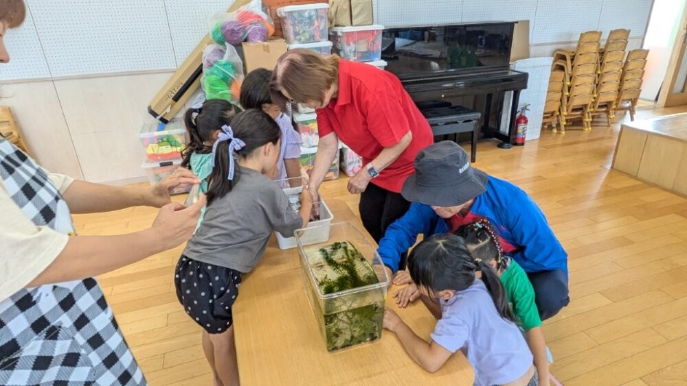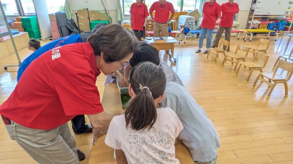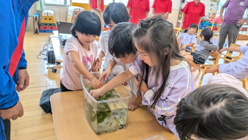 画像だけでは分かりにくいので、実際にどのような生き物が生息しているのか、碧水ホタルの里の皆さまが準備しておられ、園児さん達も興味津々(*’ω’*)
