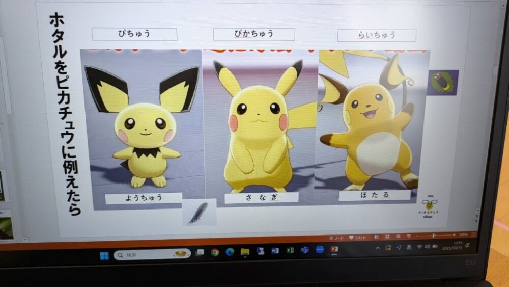ホタルの幼虫は「ぴちゅう」、さなぎは「ぴかちゅう」、ほたるは「らいちゅう」と例に挙げられました。