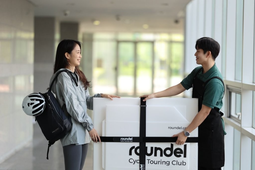 韓国内の空港で提供している輪行支援サービス「ラウンデル・グリーンパックサービス」で使用するのがこの折り畳み式ケースだ。出発する空港でケースを貸し出し、到着空港でケースを畳んだ状態で預かるサービスになり、自転車の収納は前輪を取り外すだけなので初心者でも可能だ。