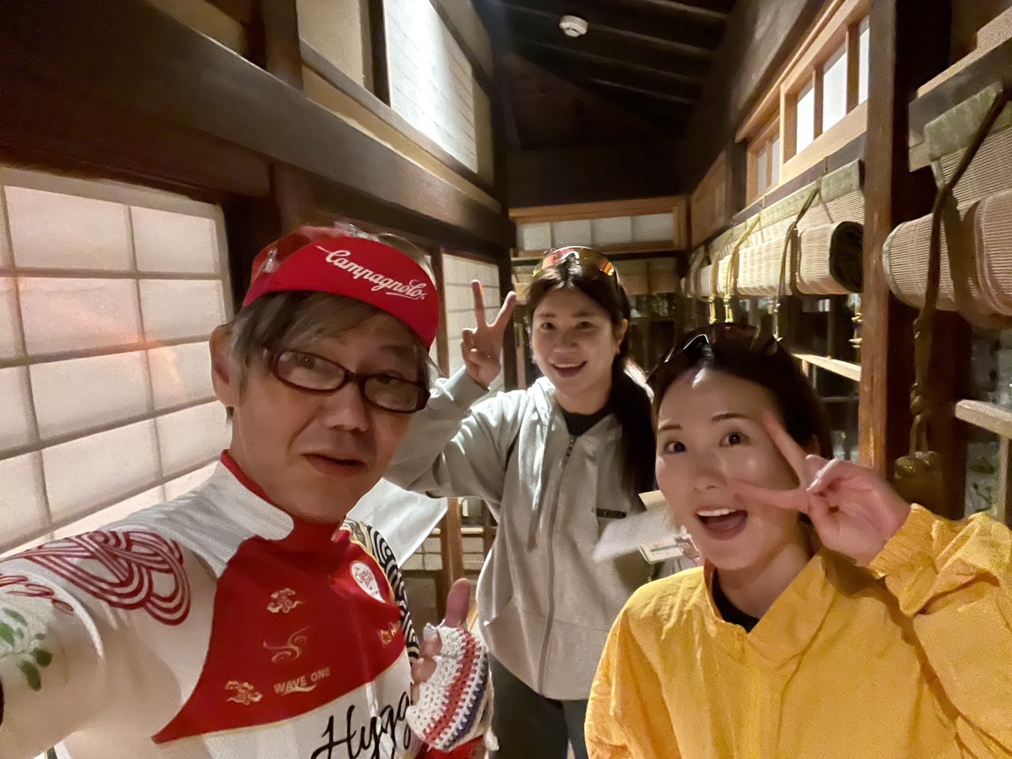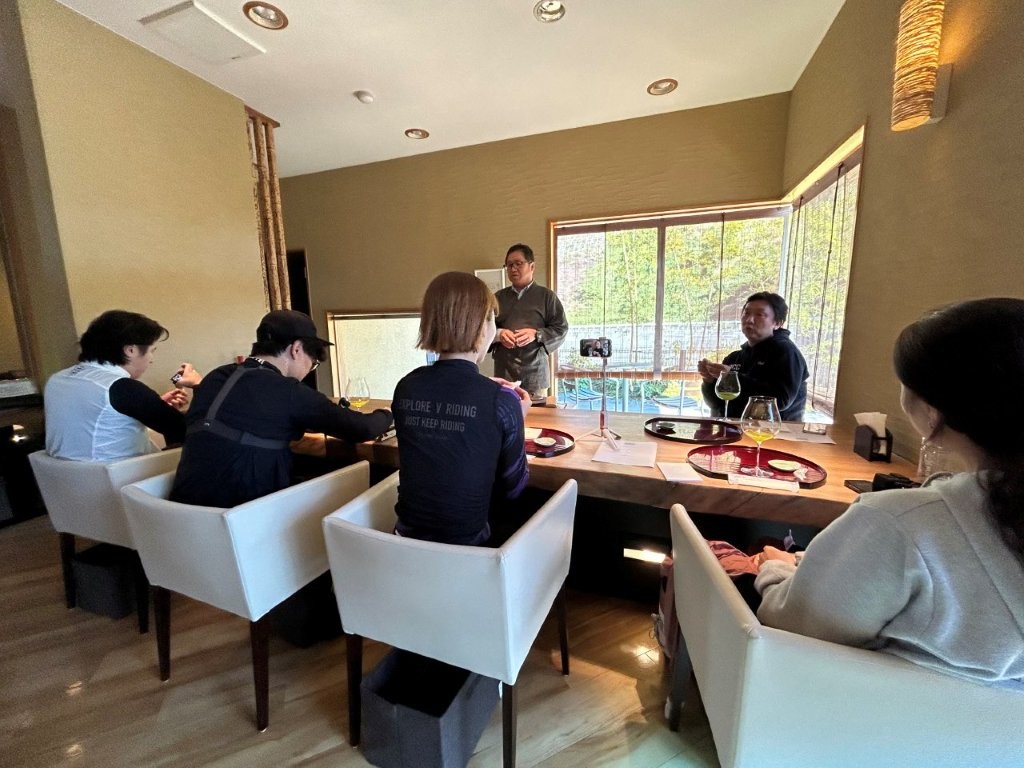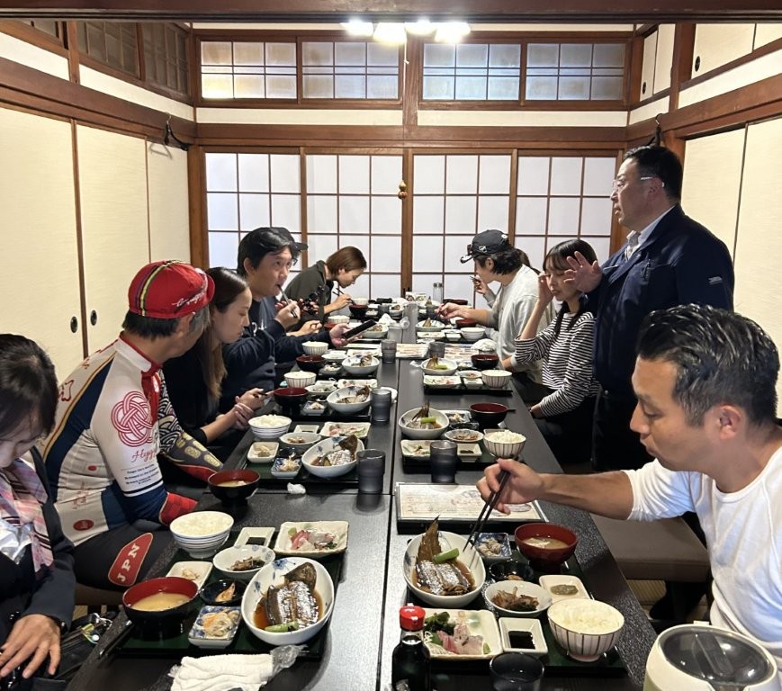 料理の説明には社長がお越しになり面白おかしく説明していただいた。フランス料理の高級食材、シタビラメをこちらでは「クツゾコ」といって上品な白身を活かした煮付けが定番だ。ほかにもイソギンチャクの味噌煮など珍しい料理に興味を示されていた。韓国の方のサイクルジャージへの着替えはお客が多い中別室を用意してもらい助かった。