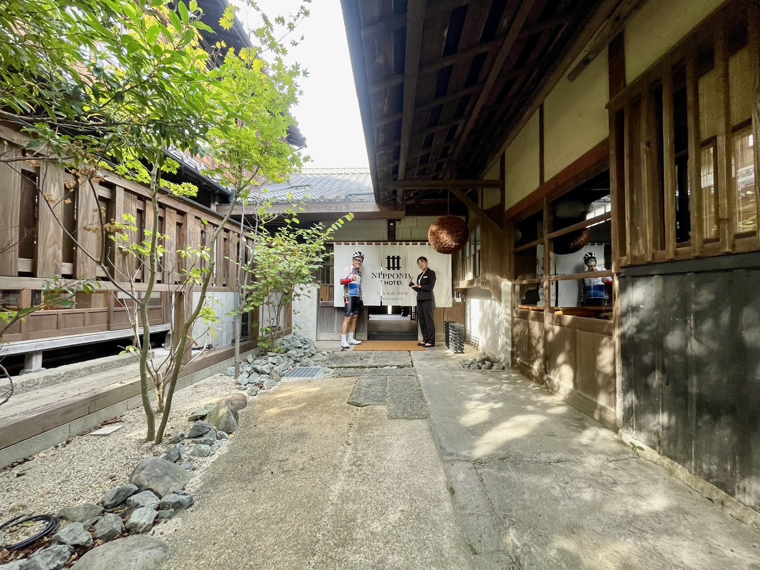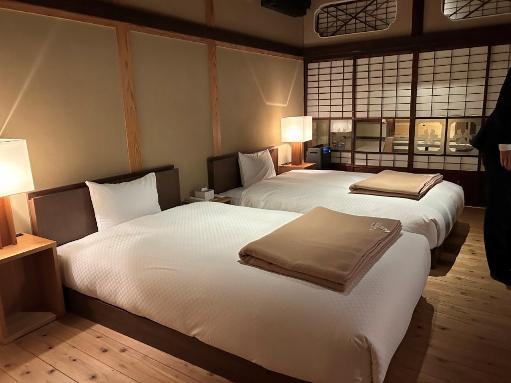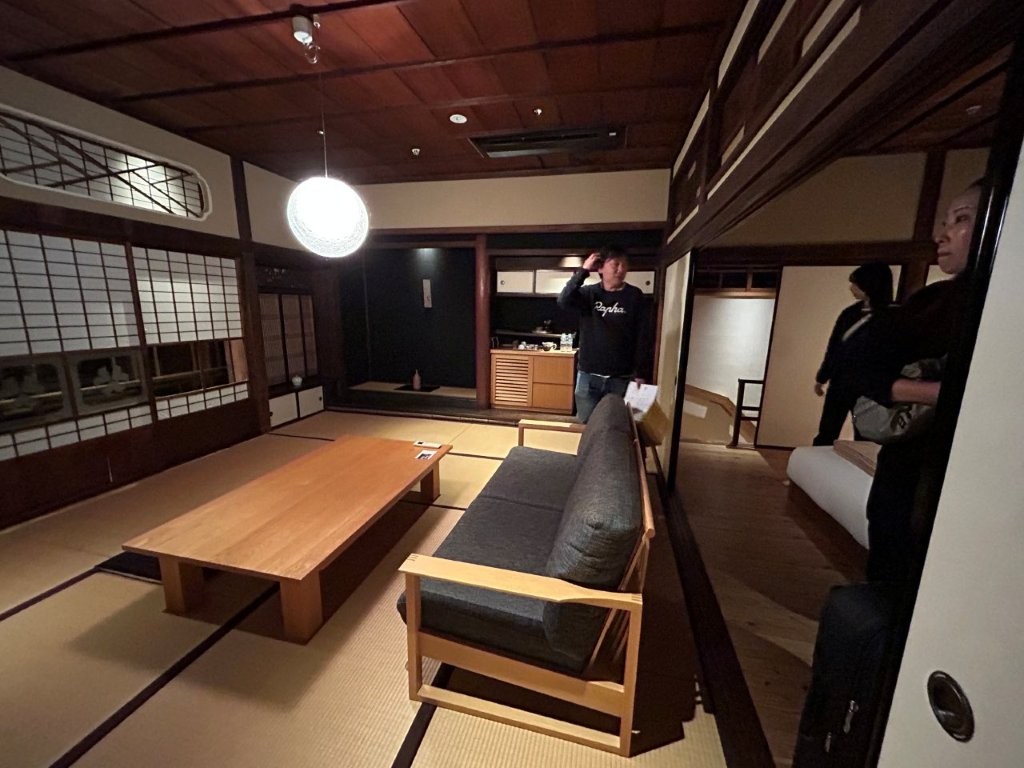 NIPPONIA HOTELには予定より少し早く到着したので客室を見学させてもらった。旧喜多屋別邸のフロントとレストランがあるKITAYA BETTEI棟の客室は2部屋、ここには女性2名が宿泊された。男性3名は少し離れた旧大坪茶屋OTUBO TYAHO棟。
