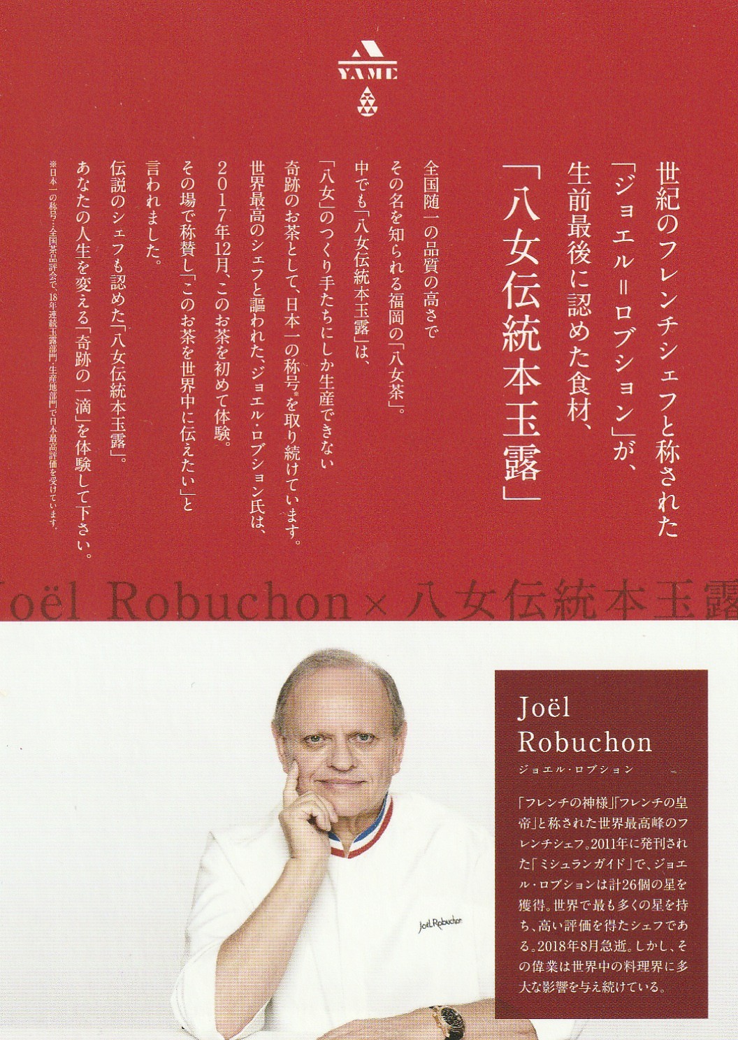 木屋さんは2017年、八女伝統本玉露と八女茶の魅力を伝えるため、カリフォルニアのレストラン「single thread」との料理ペアリングにニューヨークを訪問されている。その年の12月、ついにフレンチの巨匠、ジョエル・ロブションに八女伝統本玉露に感動してもらい、翌年にはニューヨークのロブションのレストランで八女茶とともに料理を味わうペアリングイベントが実現し、八女伝統本玉露は世界のフランス料理を牽引してきた「神様」が生涯最後に認めた食材になった。