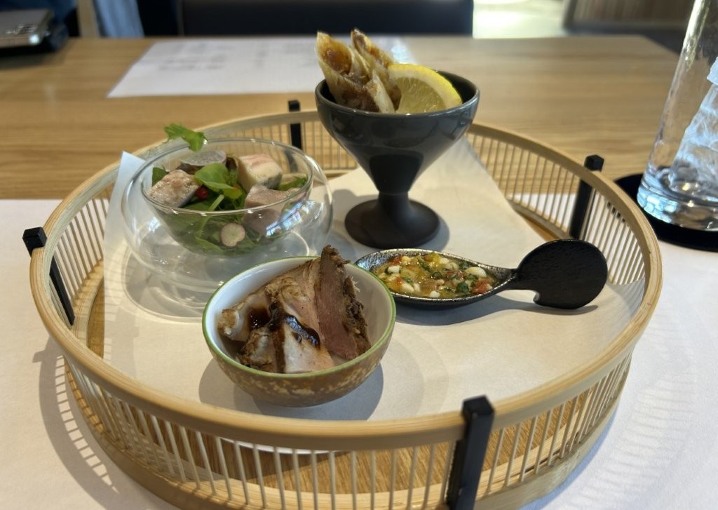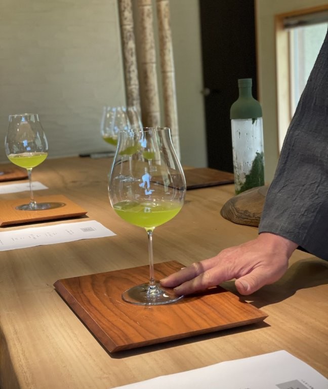 「みなさん、自転車で来られたので冷たいものから始めましょう」と、木屋さんの祖父の名を冠した茶葉「茶ノ匠 芳友」と星野の水によりフィルターインボトルで抽出された水出しの煎茶はリーデルのリースリングタイプの中でも一番薄いグラスに注がれる。木屋さんは口当たり重視されて、ほかのタイプのグラスも磁気や陶器も器の口縁が薄いタイプを選ばれている。