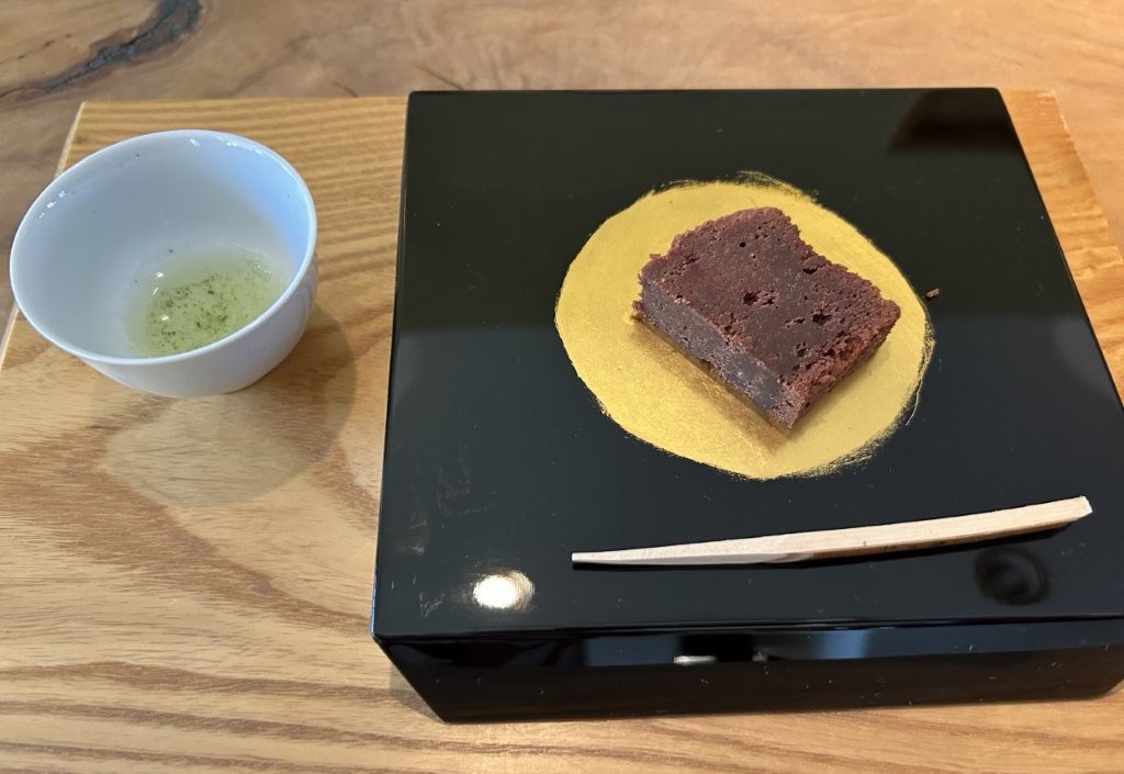 三煎目は八女の菓子職人が作ったガトーショコラを合わせられた。見事な取り合わせだった。外国の方にはこのようなサプライズがインパクトある。以前、体験した際には地元の上陽饅頭にフキノトウ味噌を合わせたり、究極はイタリアの代表的なチーズのゴルゴンゾーラだった。木屋さんが試行錯誤の結果、ブルーチーズの独特の風味と塩味が、厚めの少し甘味がある皮とお茶の香りがぴったりと合った。