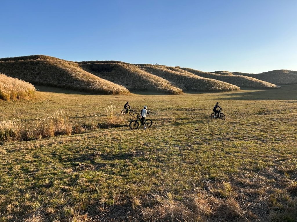 ミルクロードのアップダウンから57号に一旦出て、町古閑牧野道に入って農業倉庫で事前に用意していたE-MTBに乗り換えて牧野ライドを体験してもらった。