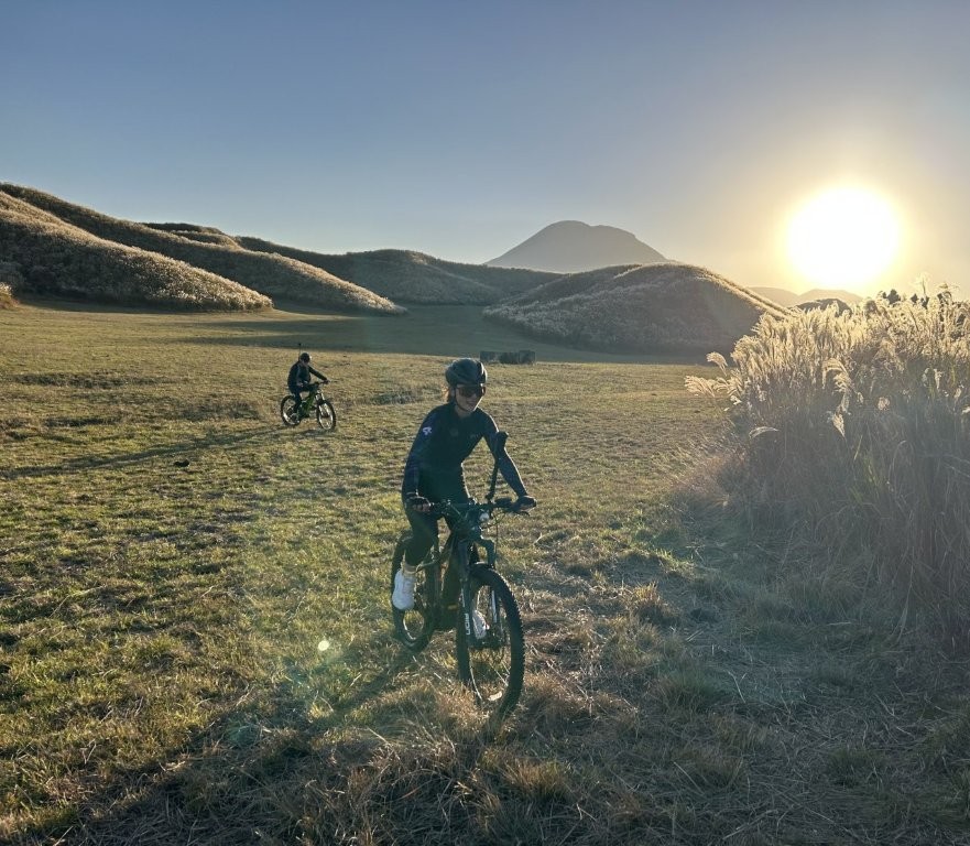 最後は阿蘇パノラマラインの放牧場付近からサイクリングを始めた。草原に佇む牛や馬の牧歌的な景色に感動されていた。中岳火口は風向きが悪く火山ガスの影響で閉ざされて少し待ったが見学してもらうことはできなかった。フィナーレは道の駅阿蘇までの15kmのダウンヒルを満喫してもらって握手とハグして私の仕事は終わった。
