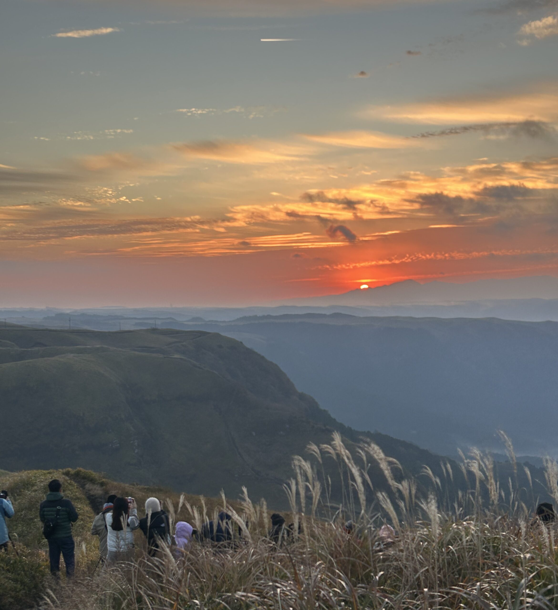 クライマックスの2025年11月17日の太陽が現れると、どこからともなく歓声とシャッター音が連続した。日本全国で毎日多くの人が集まる日の出スポットは大観峰に違いないと思う。それに外国人も多い。