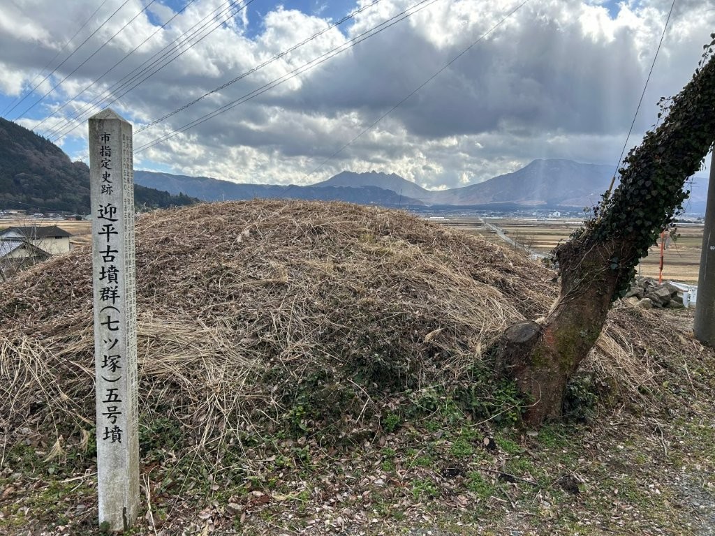 迎平古墳群、別名七ツ塚とも呼ばれ、以前は円墳が七基あったという。消滅した六号墳からは大和朝廷との強い結びつきを示す画文帯環状乳神獣鏡が出土している。時期は五世紀後半、小嵐山入口の中通古墳群とほぼ同時期から継続する古墳群と考えられるという。