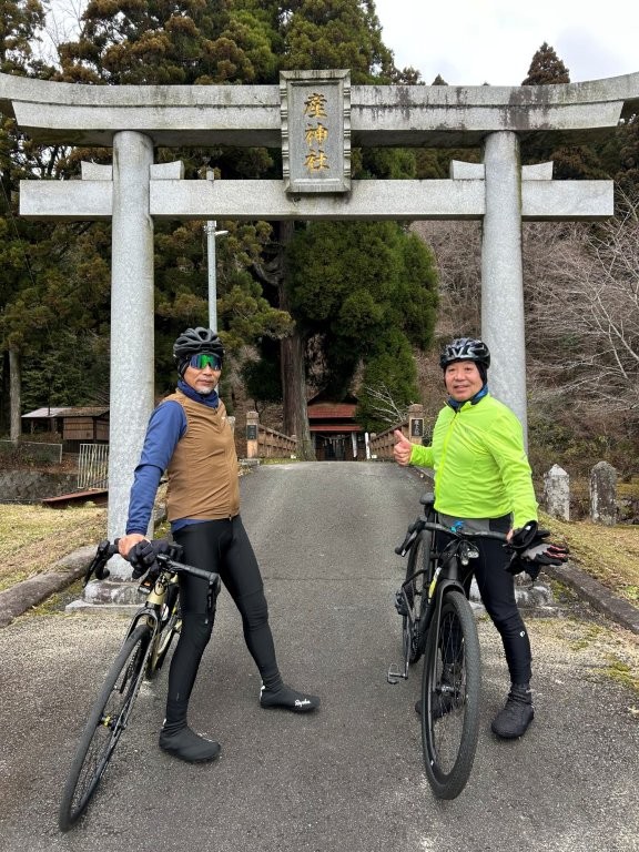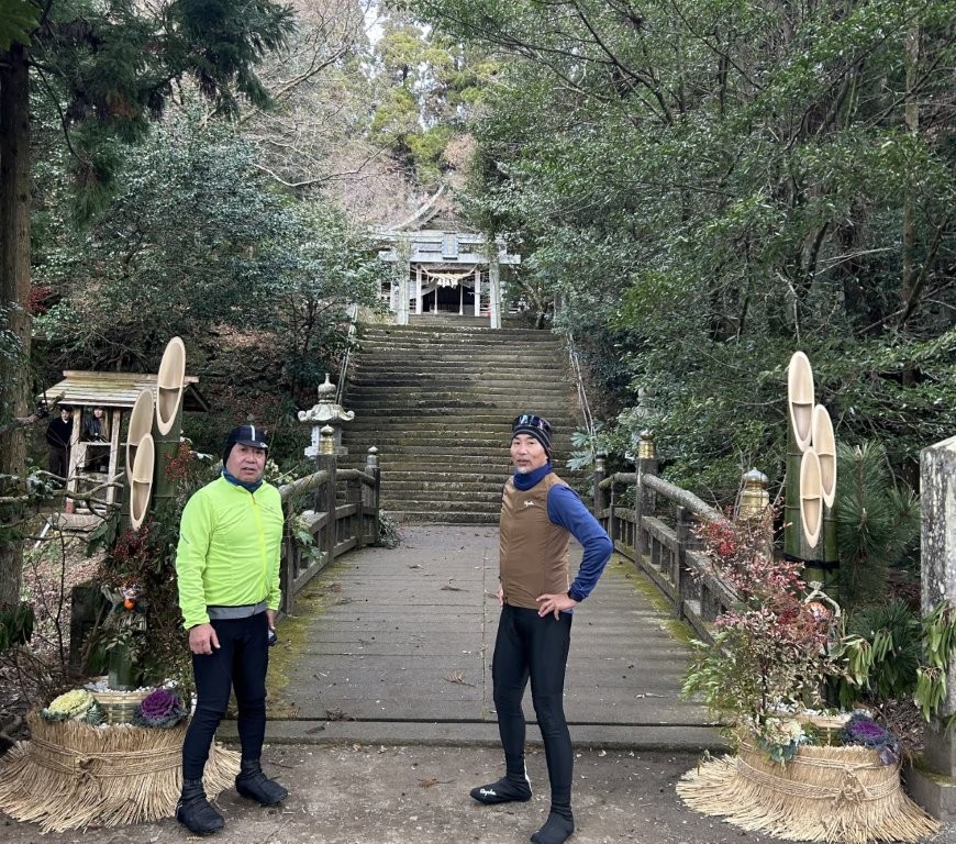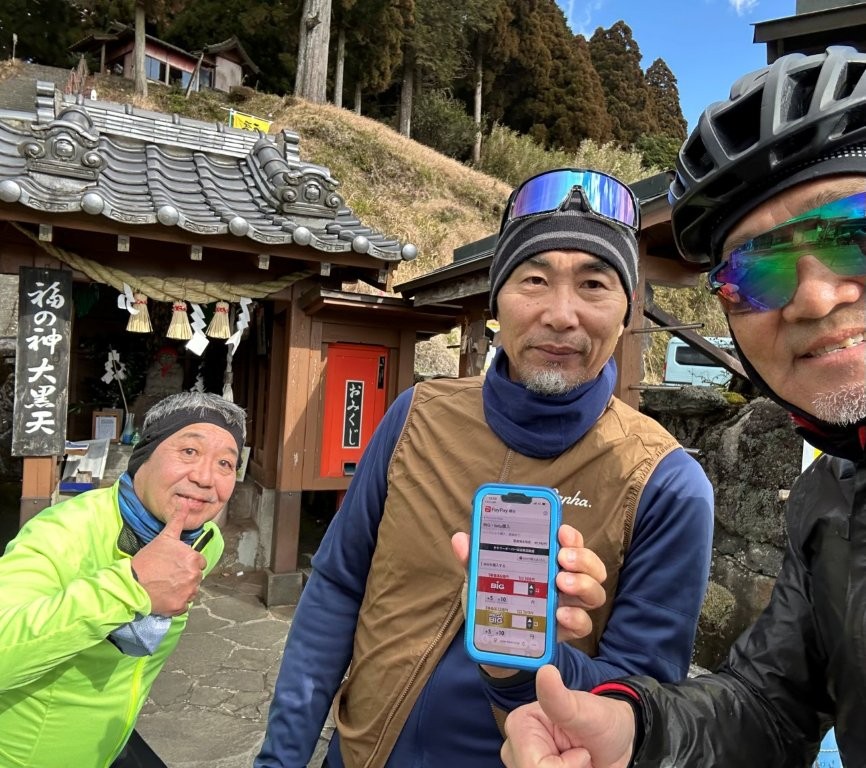天気予報では強風の上、かなり冷え込むとのことだったが2名の参加者と予定通りのコースを走ってきた。阿蘇の初走りはやはり峠、選んだのは車が少なく標高もそれほど高くない仙酔峡。その後は、阿蘇神社、国造神社、隼鷹天満宮の三社に加えて、初夢祈願として宝くじが当たることで知られている福の神大黒天、これに隼鷹天満宮の途中にある阿蘇打越神社、内牧菅原神社、産神社を加えて七社めぐりの安全祈願のライドとした。