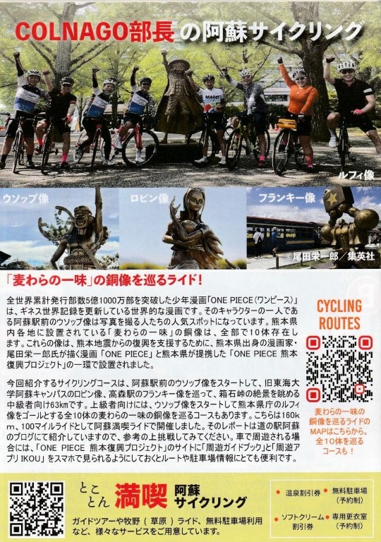 今回の記事はONE PIECE「麦わらの一味」の銅像を巡るライドで阿蘇駅のウソップ像、旧東海大学阿蘇キャンパスのロビン像、高森駅のフランキー像の3体を巡る63kmのサイクリングコースになる。上級者向けには、ウソップ像をスタートして熊本県庁のルフィ像をゴールする全10体を巡る100マイル、160kmを走ったレポートもQRコードから見ることができる。