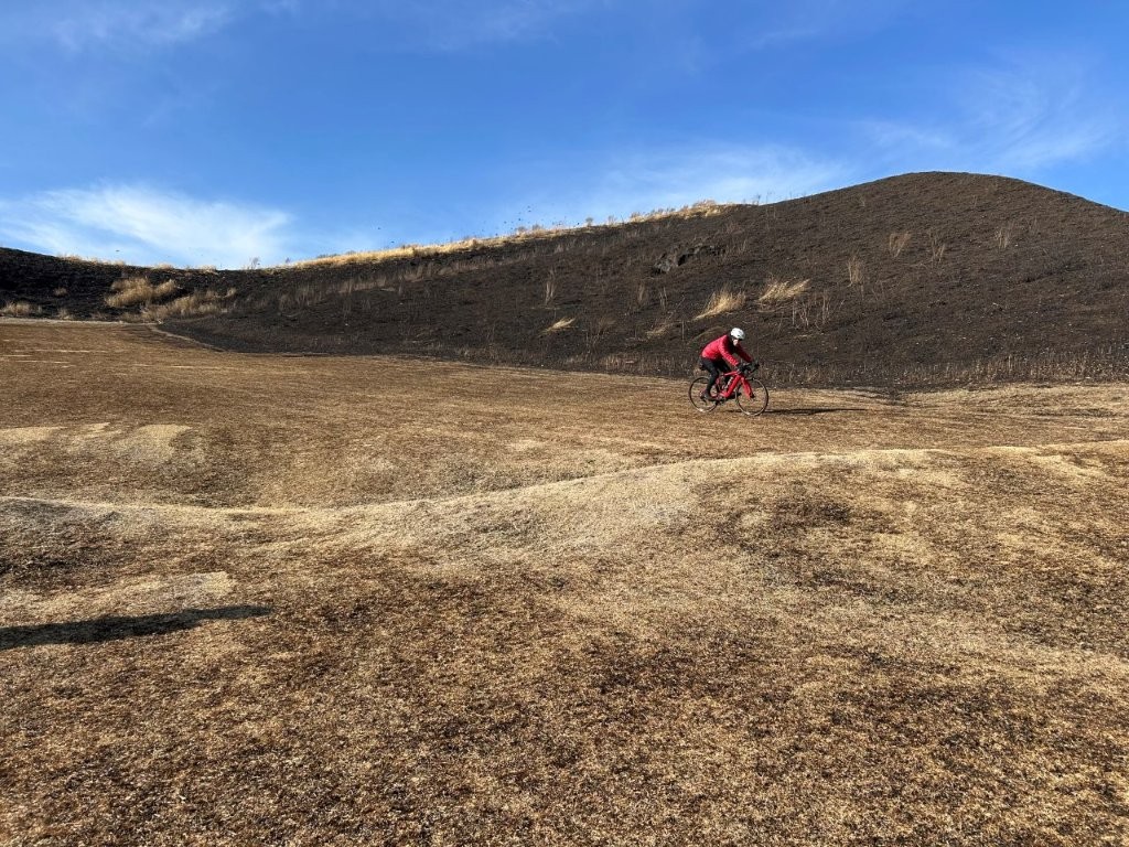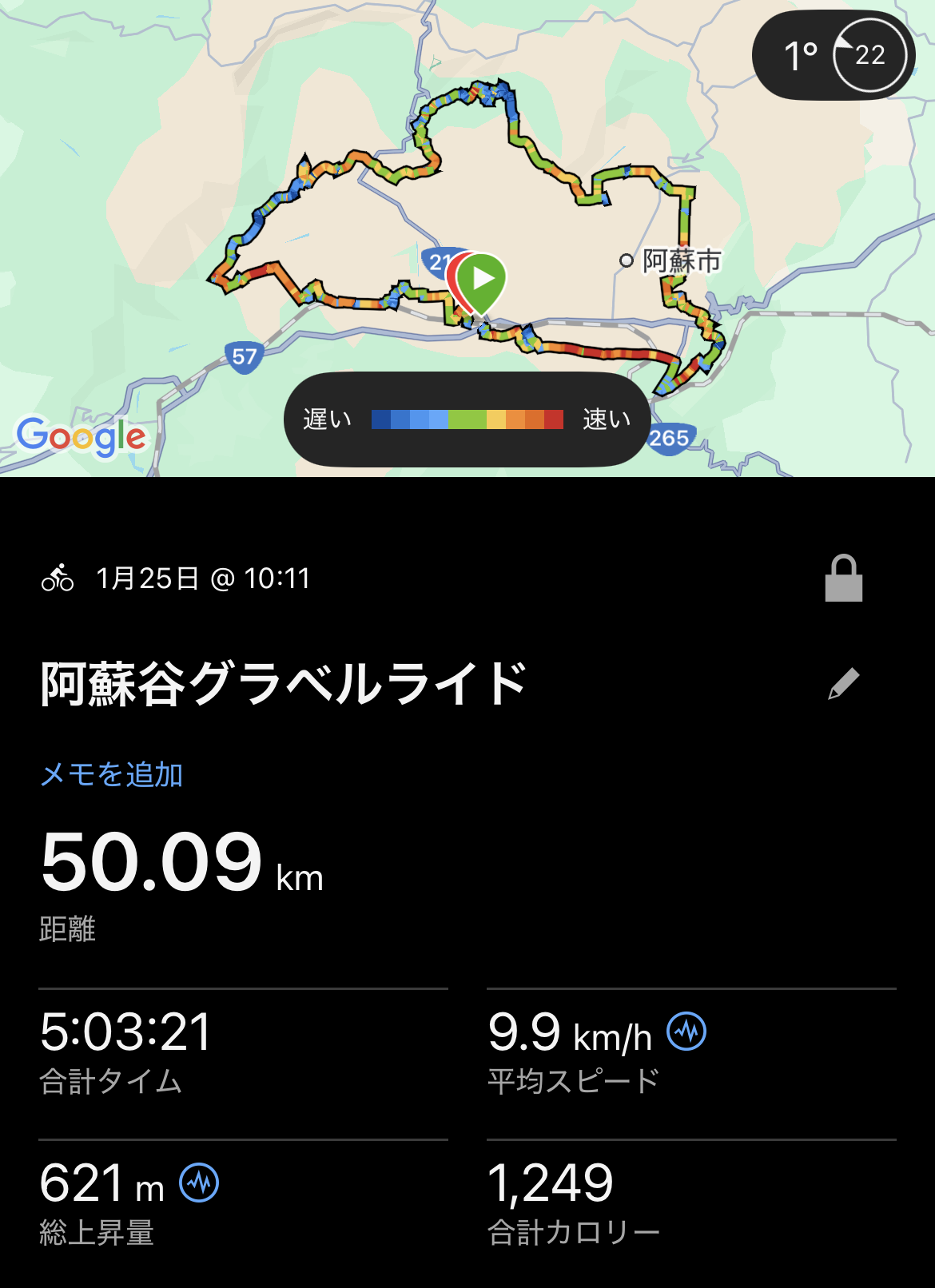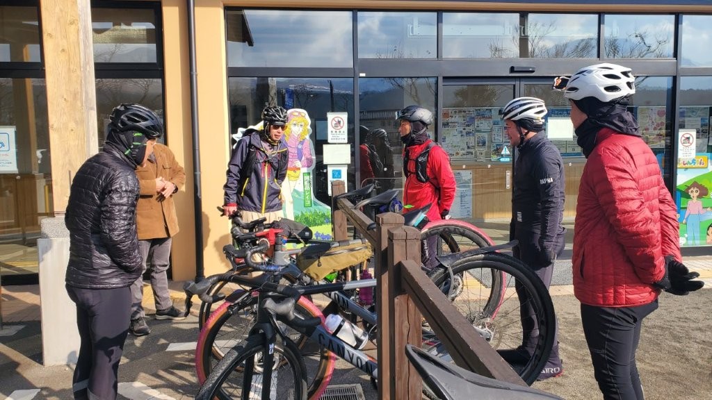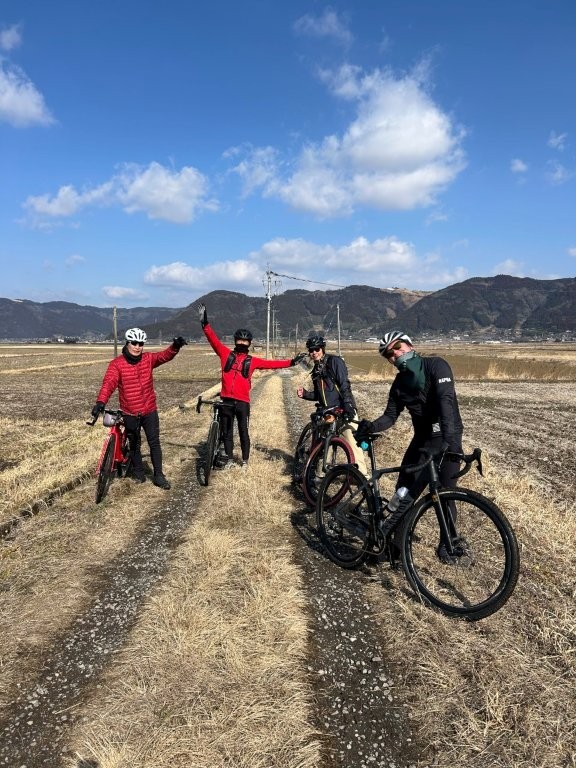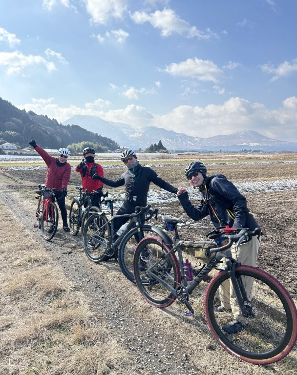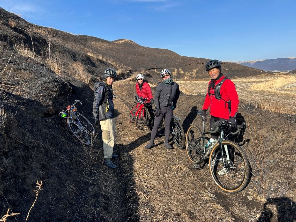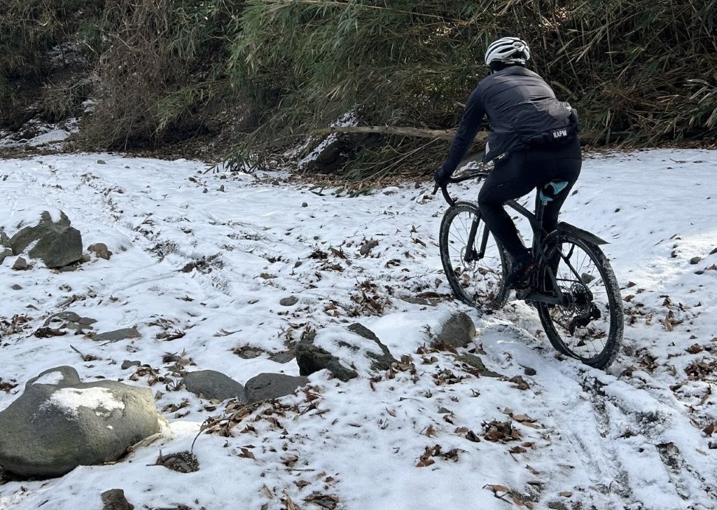 道の駅阿蘇を4名のみなさんとスタートして、すぐに荒れた田んぼ道から雪が残っている水無川へ行った。タイヤが砂に埋もれてグラベルバイクでは難しいが一気に心拍が上がって寒さが消えた。