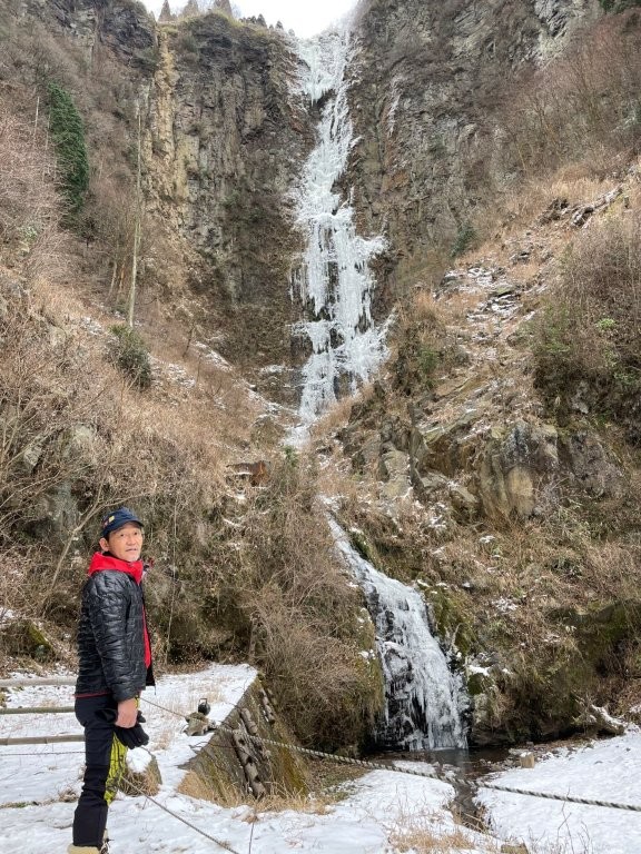 遠くから凍った古閑の滝が見えたが、自転車を置いて滝までが結構歩きがあるのでこの日は諦めた。これは昨年撮った写真、古閑の滝は約100メートルの落差があり、冬季にはその全体が凍りつく様子が見られ、氷の華や氷の羽のような美しい氷瀑が形成され冬の阿蘇ならでは景観のひとつ。