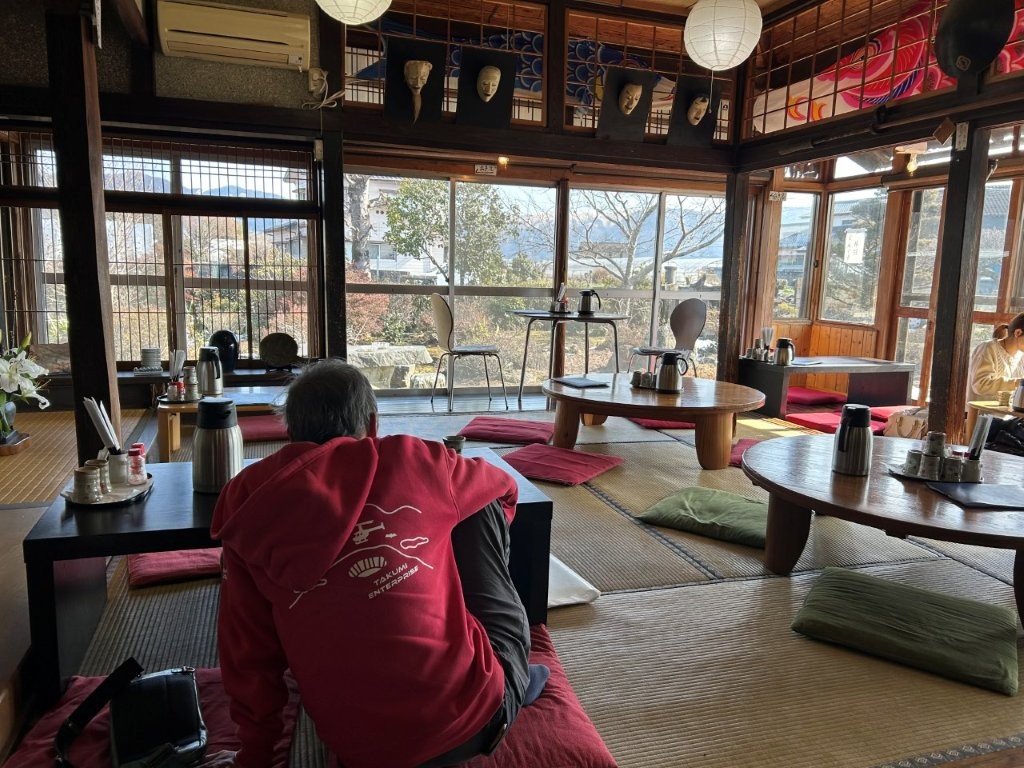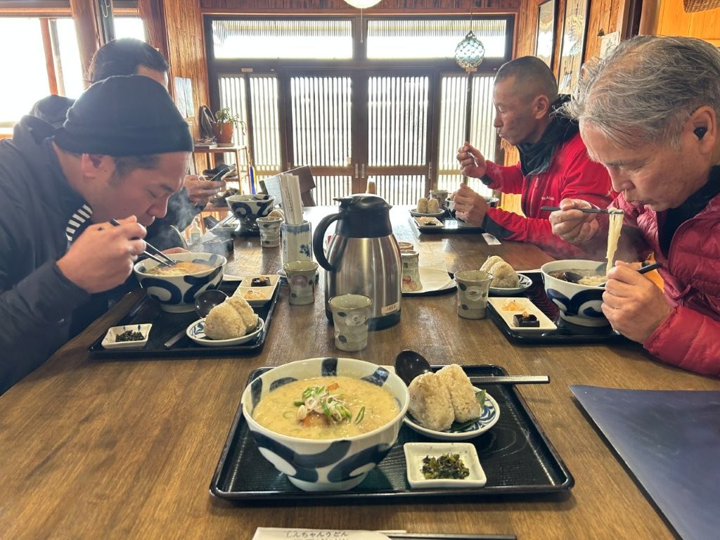 注文して10分ほどで料理が並んだ。定食はうどんに鶏おにぎりが2個と薬味の漬物に小鉢、そしてコーヒーゼリー付きで今時1000円でお釣りがくる。ポカポカの店内、席の横にはストーブがあって冬装備のウエアを次々に脱いでいくほど天国の居心地だった。