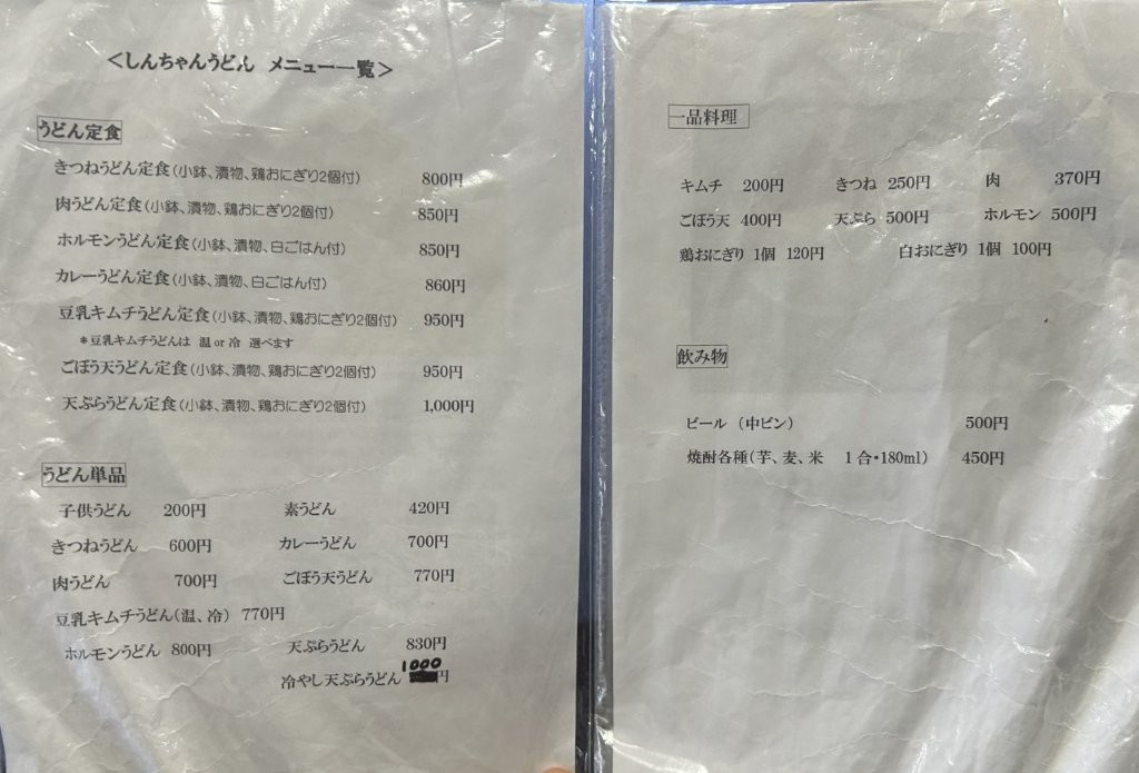 「しんちゃんうどん」は初めてだった。店に入ると実家に帰ってきたような広めの畳敷きのスペースで、年配の女性から人数を聞かれて6名掛けのテーブル席に案内してもらった。先客は4組だったが私たちの後に次々に客があり、すぐに満席になったのでここは12時前には行くべきだ。