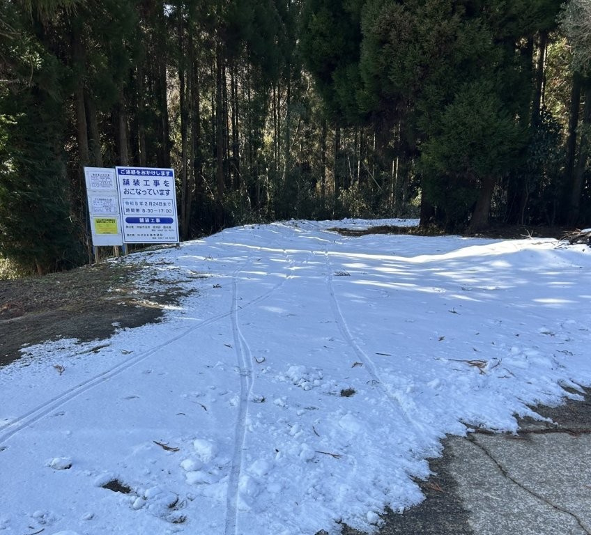 「しんちゃんうどん」から4kmほどで大観峰の麓近くの小倉林道に入る。林道入口は山の神が歓迎するかのように雪道になって冒険心がかき立てられた。その先に工事の看板があった。舗装になるらしい。ここは来る度に荒れた道に硬く砂利が敷かれて、グラベルライドとしては走りやすくなった分面白みが欠けてくる。全線舗装されるのだろうか・・・