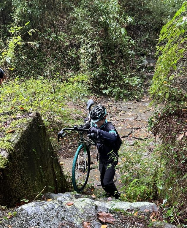 日陰には雪が残っていた。グラベルはソフトだが面白い。小倉林道とはまた違うグラベルの楽しさがあった。それに長い階段がある・・・