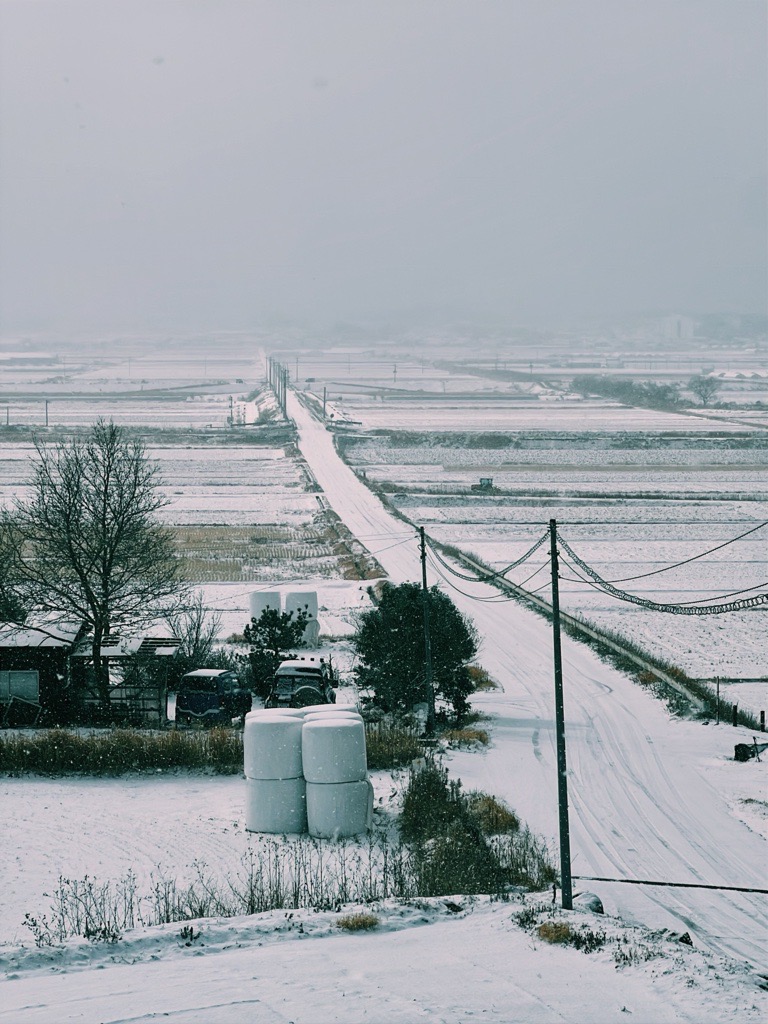 真っ直ぐ続く道と真っ白に染まった田園風景が感動的でした~✨