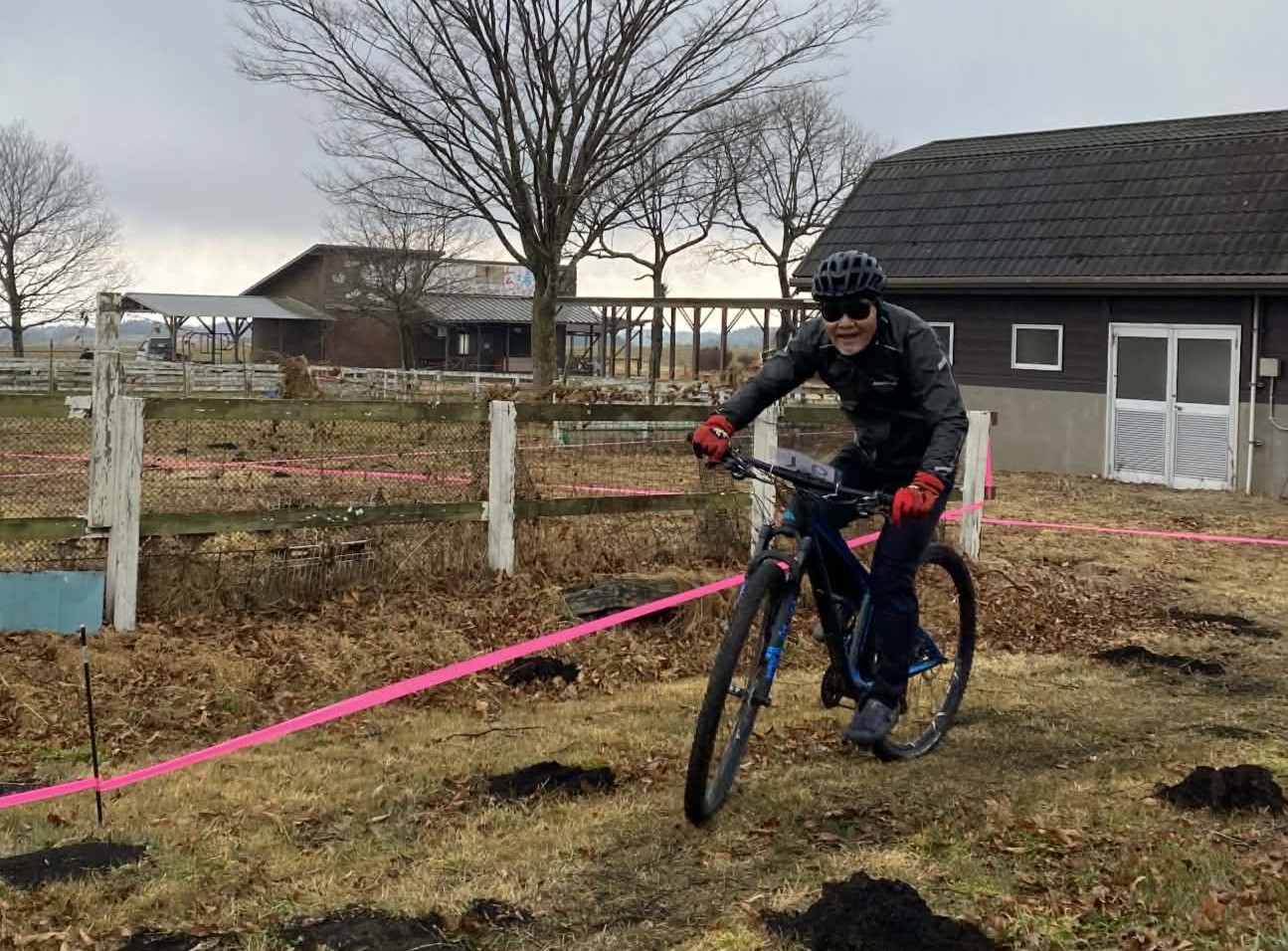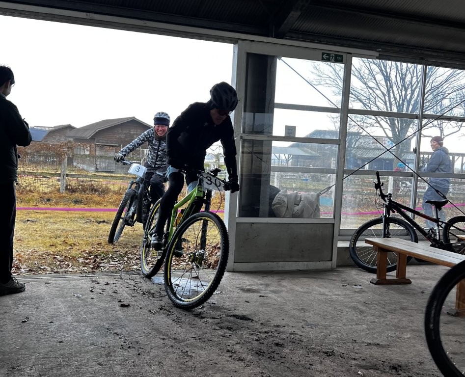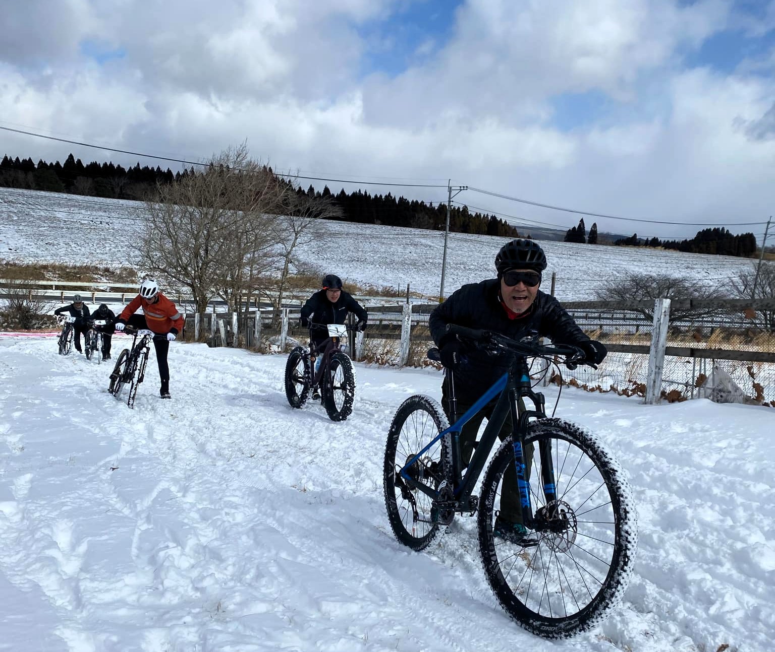 阿蘇満喫MTBライドを「産山村雪上マウンテンバイク100分耐久ライド」に遠征して開催しました。このイベントは、会場となる「UBUYAMA PLACE」の敷地内に作られた1.3kmのコースが舞台となり、前半50分、後半50分の100分に何周できるかを競う耐久レースです。