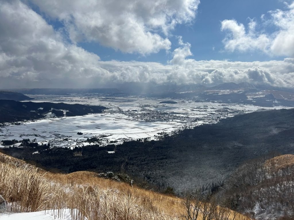 スカイライン展望所に到着すると、そこから見下ろす阿蘇谷は一面が真っ白な銀世界でした。思わず軽トラから降りて写真を撮ろうとドアを開けた瞬間、爆風と冷凍庫のような空気が肌を刺し、慌ててドアを閉めて防寒具とグローブを身につけました。