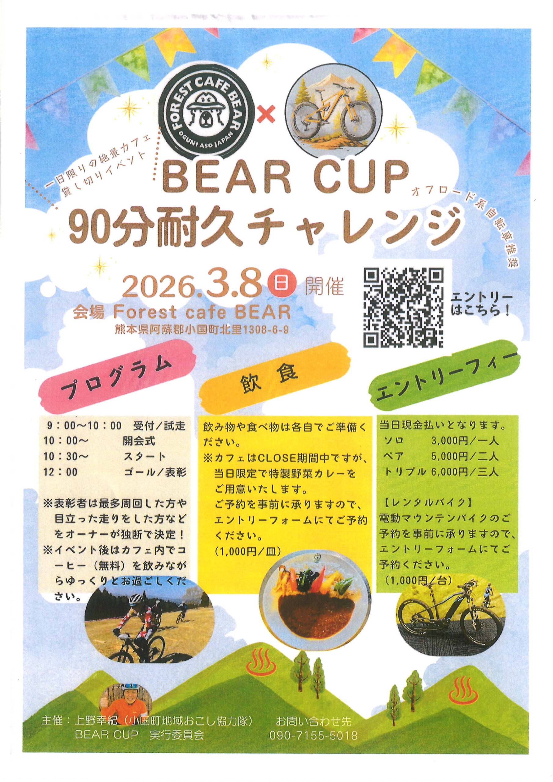 続いて2月15日に小国で開催される阿蘇満喫グラベルライドをプロデュースしてもらっている小国町地域おこし協力隊の上野幸紀さんが主催する交流型サイクルイベント「BEAR CUP 90分耐久チャレンジ」を紹介します。このイベントも阿蘇満喫MTBライドの遠征開催という位置付けになります。