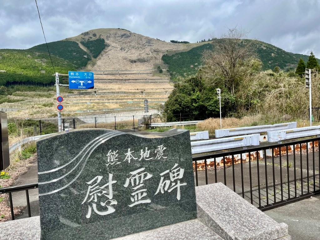 途中、東海大学阿蘇キャンパスの学生たちが暮らしていた学生村跡に立ち寄り、熊本地震の様子を話しながら進んだ。そして10時、2016年4月14日の熊本地震で崩落した旧阿蘇大橋のたもとに到着した。