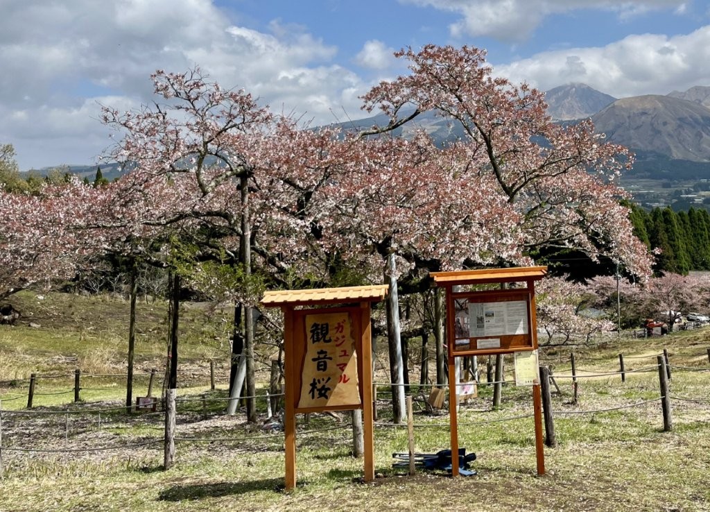 観音桜を選んだのは、牧野の中に咲く一本桜だからだ。 開花の時期がちょうど野焼きのあとに重なり、 阿蘇五岳を背景に、黒く焼けた牧野と淡いピンクの花が くっきりと対照をなすこの阿蘇らしい景色を見てもらいたかった。