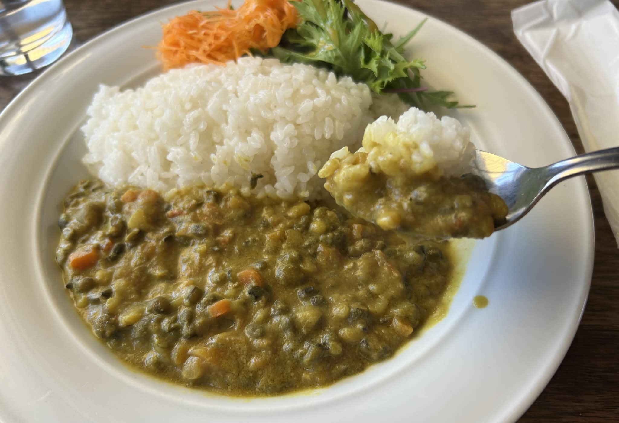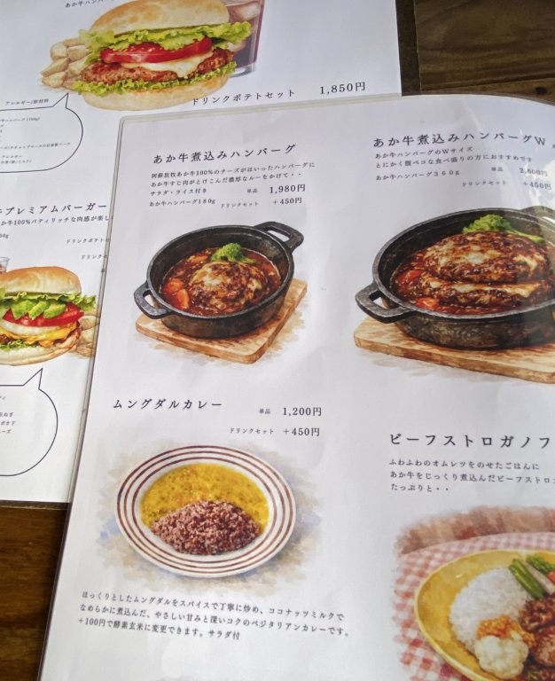 私はムングダルカレーを注文した。 インドでよく食べられる挽き割り豆・ムングダルを使ったカレーで、 肉が入らないぶん軽く、あっさりとした味わいが特徴だ。 ほかの参加者は、あか牛バーガーやビーフストロガノフなどそれぞれ選んでいた。