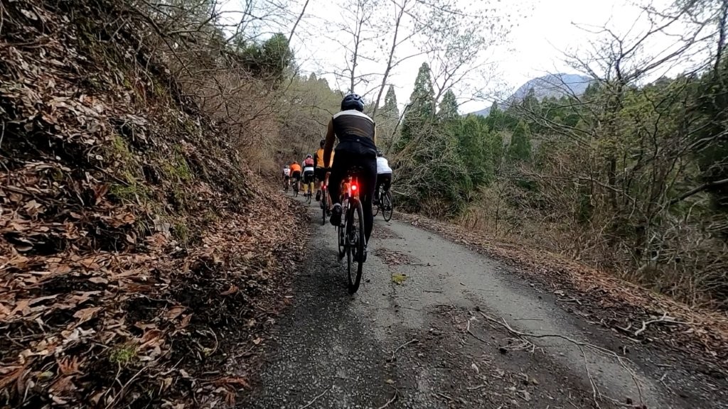 ただし、下りの道には木の枝が散乱していたり、ところどころ泥が流れ込んでいたりと、路面状況は万全ではない。そのため、参加者のみなさんには「ここからはゆっくり、安全第一で下りましょう」と声をかけた。もちろん前後のライトは全員点灯だ。