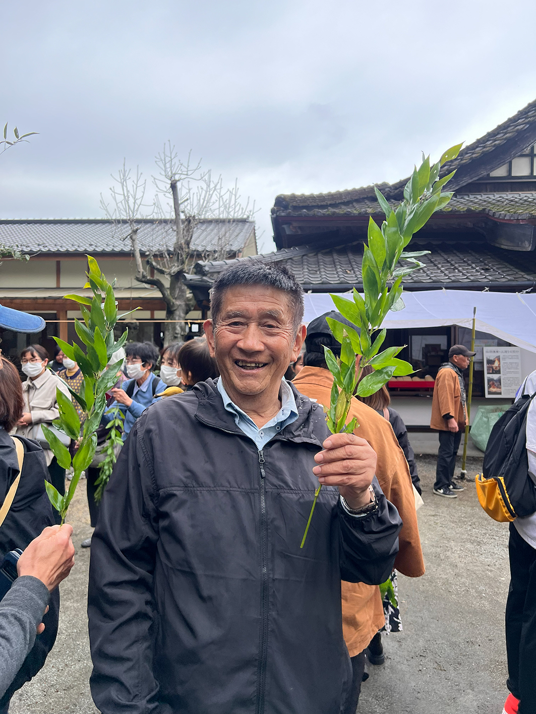 観音笹を熱湯につけて頭にかぶったり、お客様に向けて飛ばしたり。