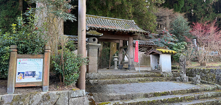 多数の仏像、古文書がその歴史を物語っています。毎年4月13日には、山伏による火渡りの荒行が行われる「阿蘇山観音祭り」が行われます。境内には阿蘇三十三ヶ所の石仏が祀られていてお砂踏みができます。