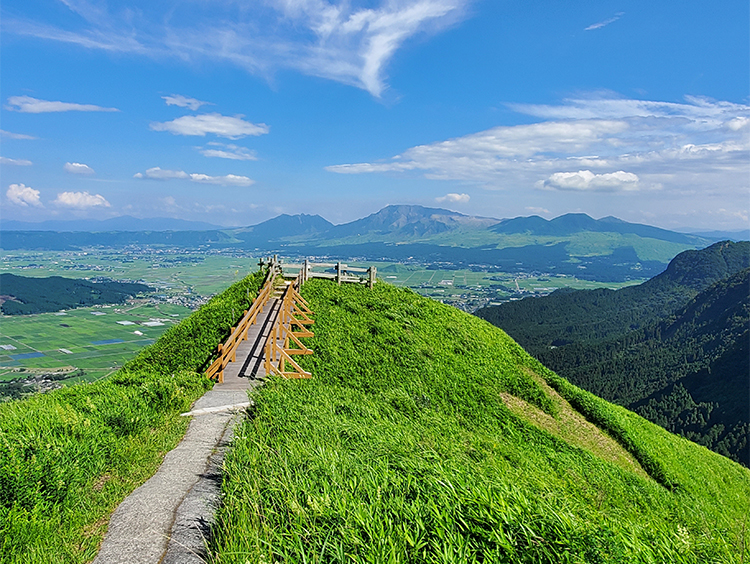ミルクロード沿いにある阿蘇の絶景スポットのひとつ。外輪山から細く突き出した形になっている展望所からは、阿蘇谷、米塚、阿蘇五岳を一望でき、展望所への細い尾根沿いの道を歩くと、阿蘇の空を飛んでいるかのように体感できます。