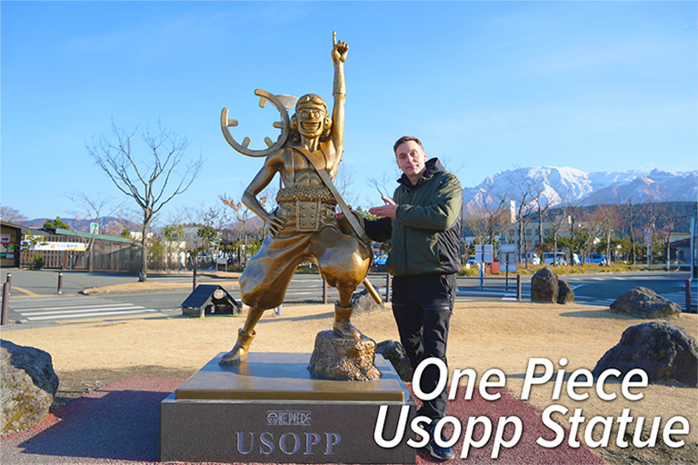 Part of the One Piece Kumamoto Revival Project, to support the region’s recovery from the 2016 earthquake. The Usopp statue is positioned against the stunning backdrop of Mount Aso, a must-visit spot for One Piece fans and travelers alike.