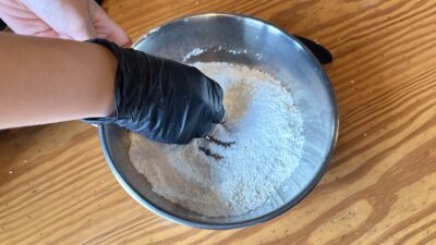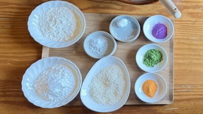 1️⃣First, we ground rice into flour and sifted it, then mixed it with starch, flour, sugar, and salt.