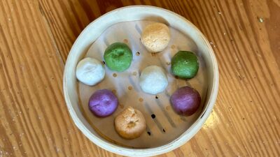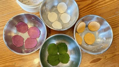 2️⃣Add vegetable powders like purple sweet potato, spinach, and carrot. Mix with water, knead into dough, and roll it into small wrappers. Place a slice of sweet potato on top, then add a filling of red bean paste or cream cheese.