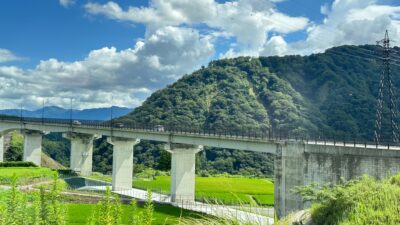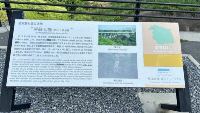 On the left side, you can still see the ruins of the old Aso Bridge, which collapsed during the earthquake and remains stuck in the valley. On the right, the newly built Aso Bridge now stands as an important connection to Minamiaso.
