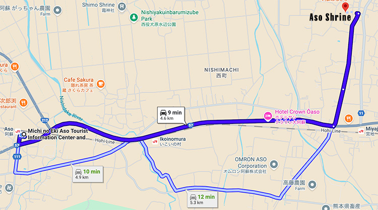 By car/taxi – approx. 9 minutes drive from Michi no Eki Aso. (Parking free for up to 30 minutes)