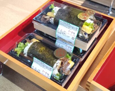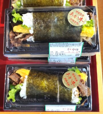 Here at Michi-no-Eki Aso, we hear that the vendors who regularly prepare delicious boxed meals will be offering Ehomaki again this year. Although today is still one day before Setsubun, I already spotted some on sale. One in particular caught my eye: a perfectly sized Ehomaki made with Aso’s famous Aka-ushi (Aso brown beef).