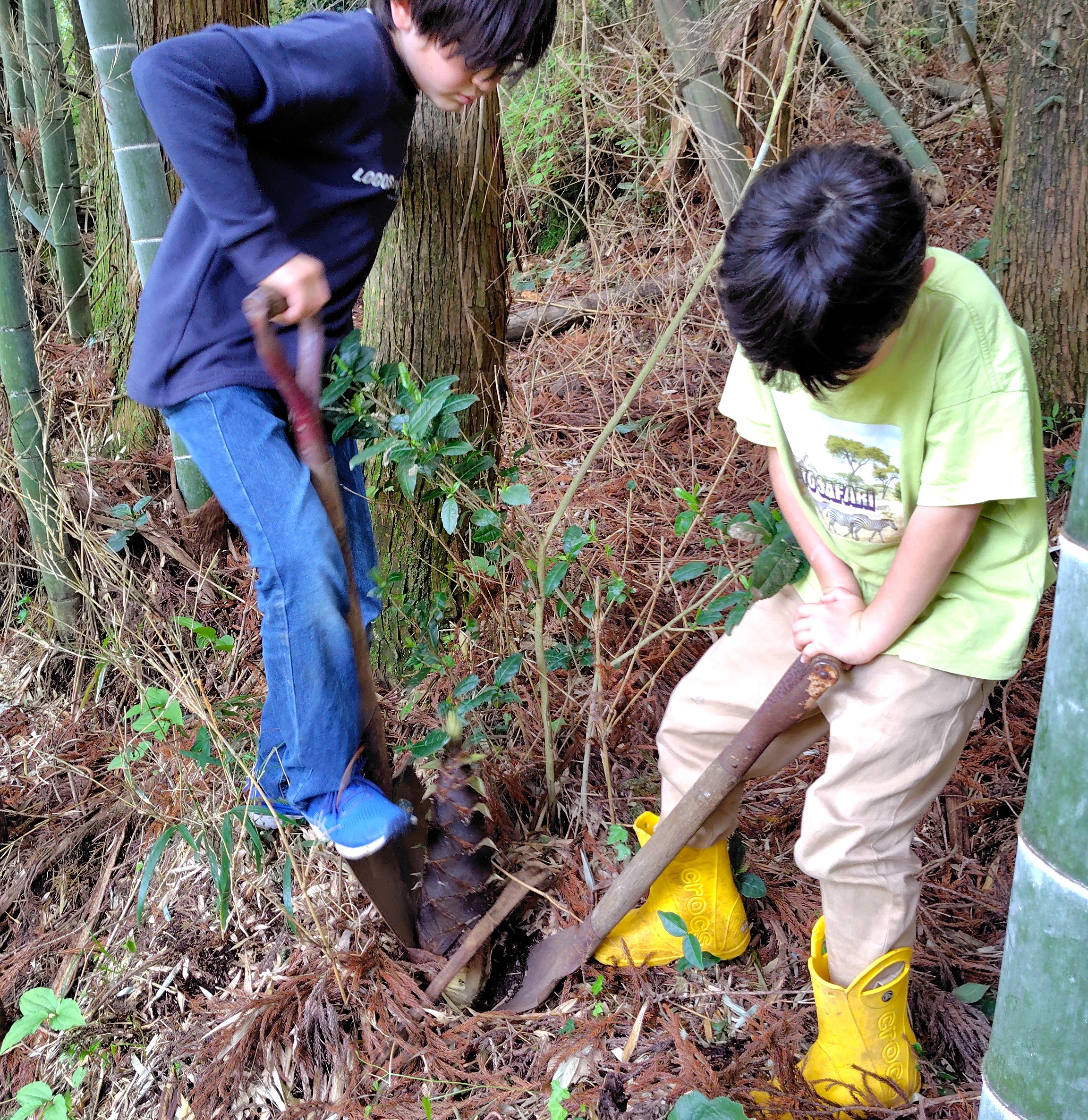 My sons get especially excited when they spot new shoots popping up. Maybe it’s their wild instincts kicking in—they keep digging up more and more, saying, “It would be a waste not to eat them!” So on my days off, I find myself preparing bamboo shoots, and we end up eating them in some form almost every night.