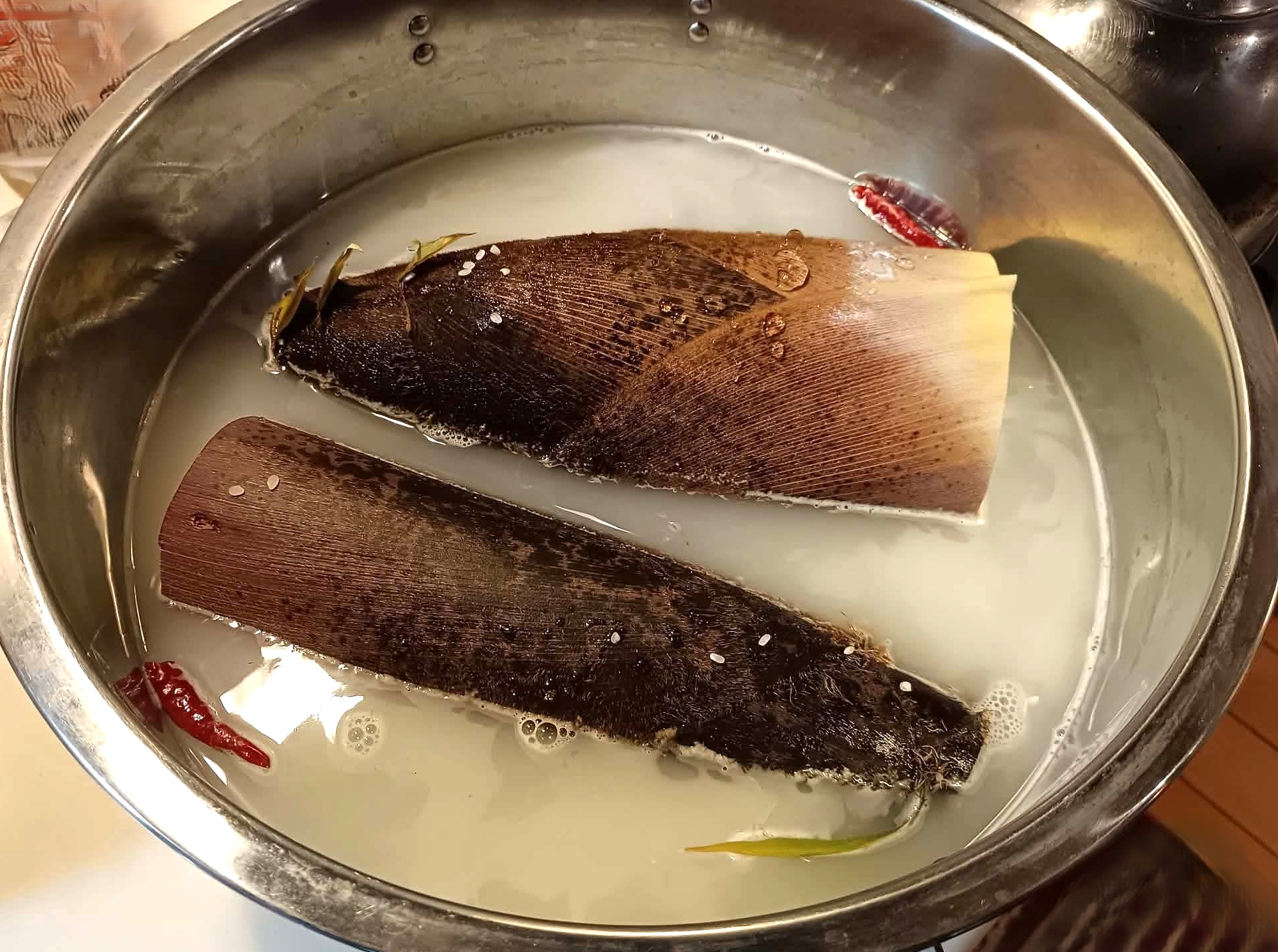 If you have rice bran, that’s ideal. If not, you can use the water from rinsing rice (a common practice in households that cook rice regularly). Add the rice bran or rice-washing water to a pot of water, along with a whole dried chili pepper. I usually boil them for about 90 minutes.