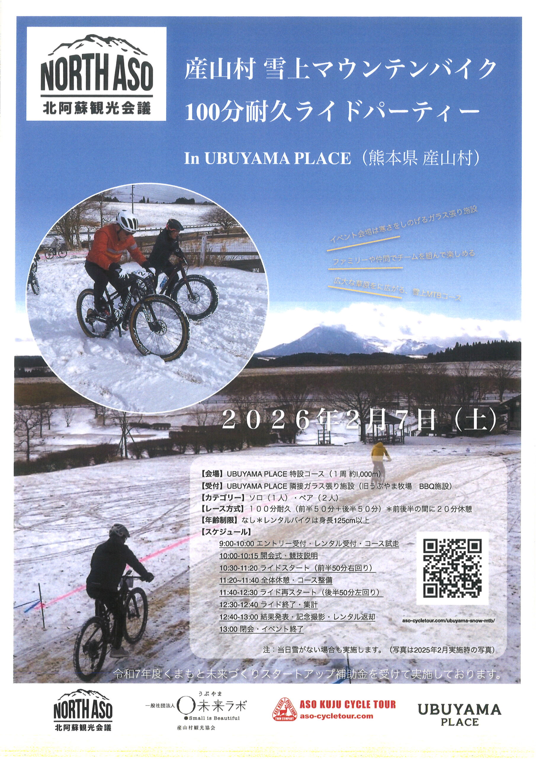 阿蘇満喫MTBライドは、「産山村雪上マウンテンバイク100分耐久ライド」に合流します。昨年は大雪に恵まれタイトル通りのイベントで盛り上がりましたが今回も期待したいものです。エントリーは下記より各自お願いします。