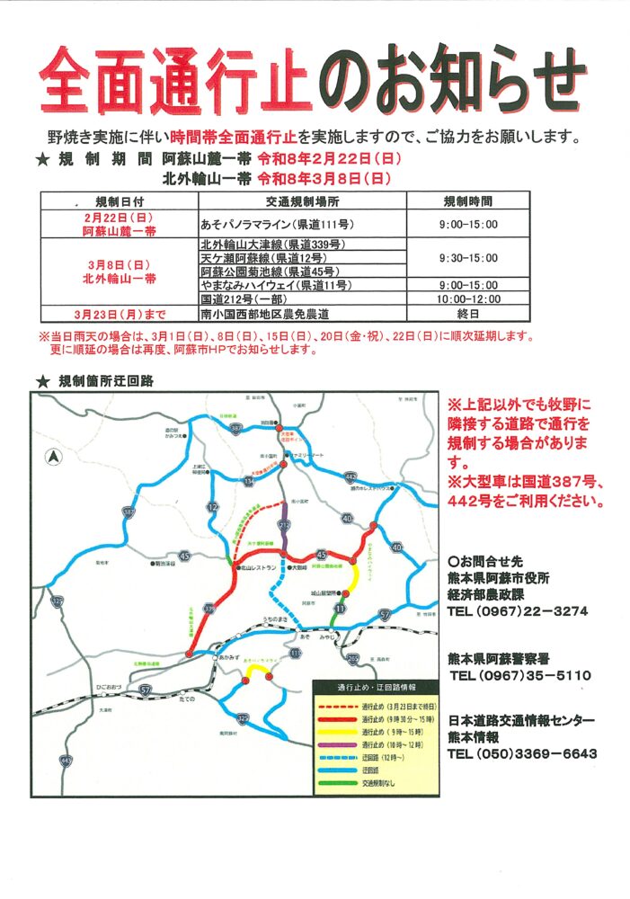 阿蘇市にて実施される野焼きに伴い、通行止め区間が発表されました。
