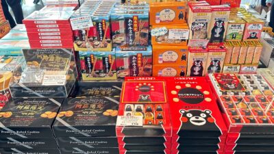 伴手禮當然也不能少,熊本熊造型的餅乾糖果禮盒,還有阿蘇牛奶限定商品都有賣。