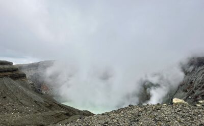 原來火山口長這樣,底下不斷冒著濃濃二氧化硫蒸氣,下面有淡藍色的清澈湖水。