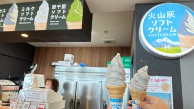 看完火山後,別忘了來根火山灰冰淇淋!它就在阿蘇山上廣場的伴手禮店裡面販賣。